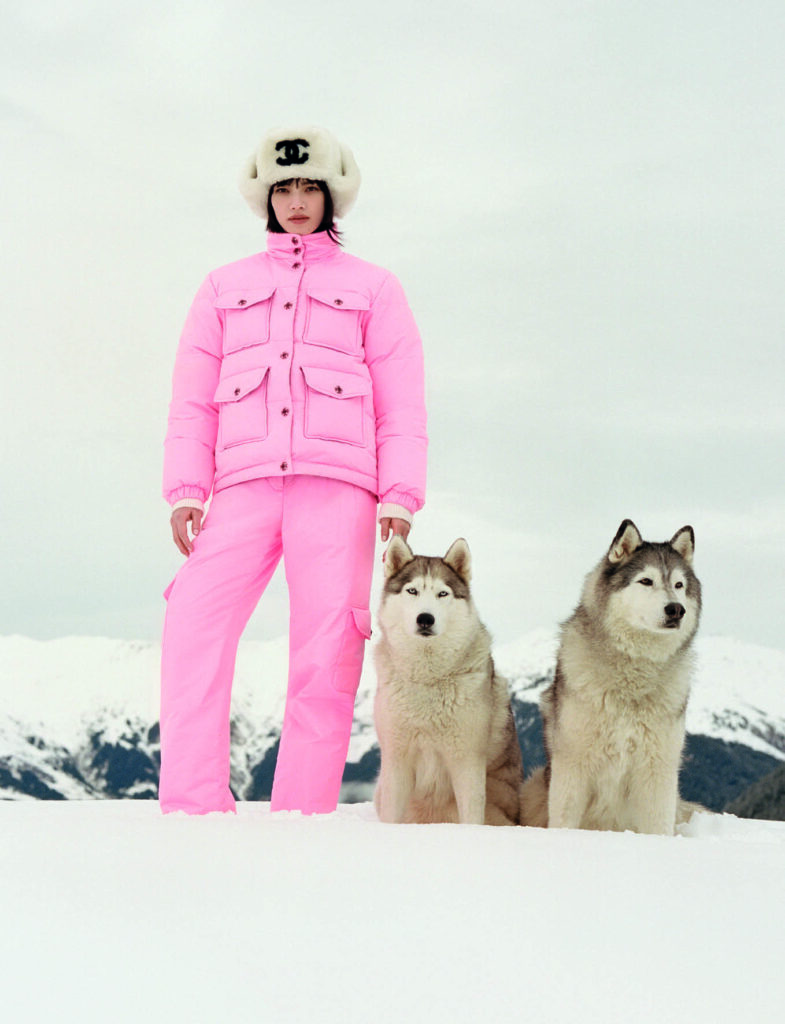 Soft, contrasting tones define the campaign. Frosted pink, luminous ecru, pine green, deep navy, and iridescent black shape a palette that feels both gentle and powerful. A pink taffeta puffer jacket paired with matching trousers and a sheepskin trapper hat creates a look that feels enveloping and warm. A multicoloured navy cardigan comes alive beside dark technical trousers. A green and purple tweed suit reinterprets Chanel’s classic codes, while an ecru cashmere sweater with a black bow adds a note of quiet romance.