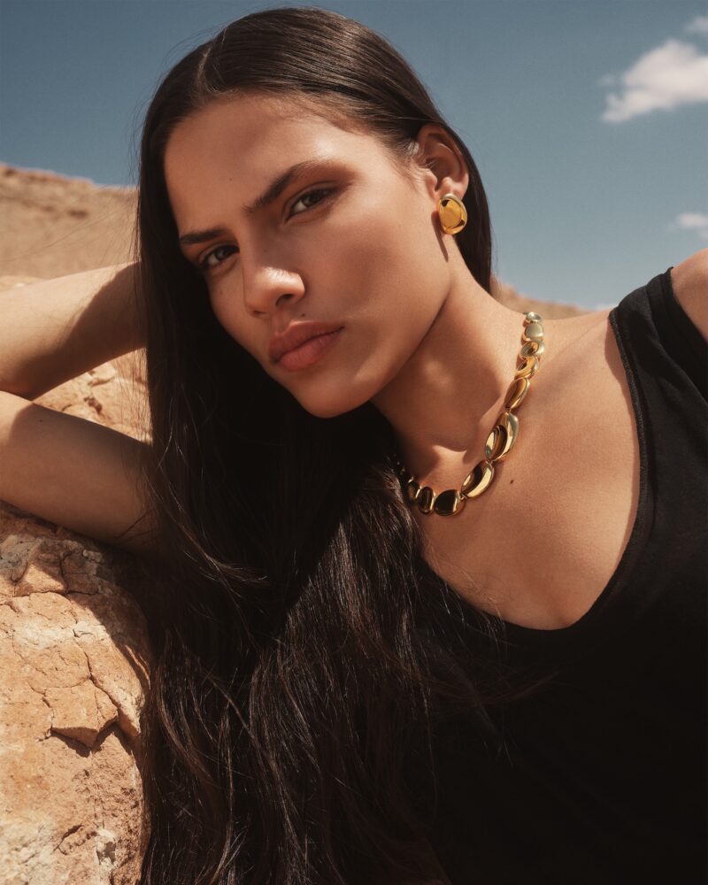 There is a wide mix in the lineup, from sculptural hoops, drop earrings and huggies to pendant necklaces, chunky rings, soft-link bracelets and curved bangles. Pieces are cast in recycled 18kt gold vermeil and designed to move with the body for a laid-back feel.