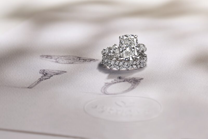 Then there’s the Aimee, the brand’s slimmest design to date, featuring diamonds set like floating lights along a fine, minimalist band, and Versailles draws on regal influence, with metalwork that creates the illusion of suspended diamonds.