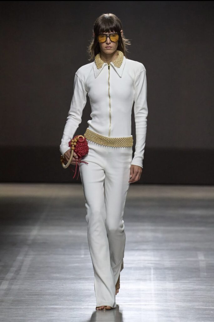 Pierre-Louis Mascia also introduced tailored jackets inspired by the Chepken, a traditional women’s vest. Cut from wool and bouclé, the pieces referenced both heritage and artisanal tailoring. Women’s communities in Azerbaijan’s Masallı and Lankaran districts contributed to the final development, grounding the collection in living tradition.